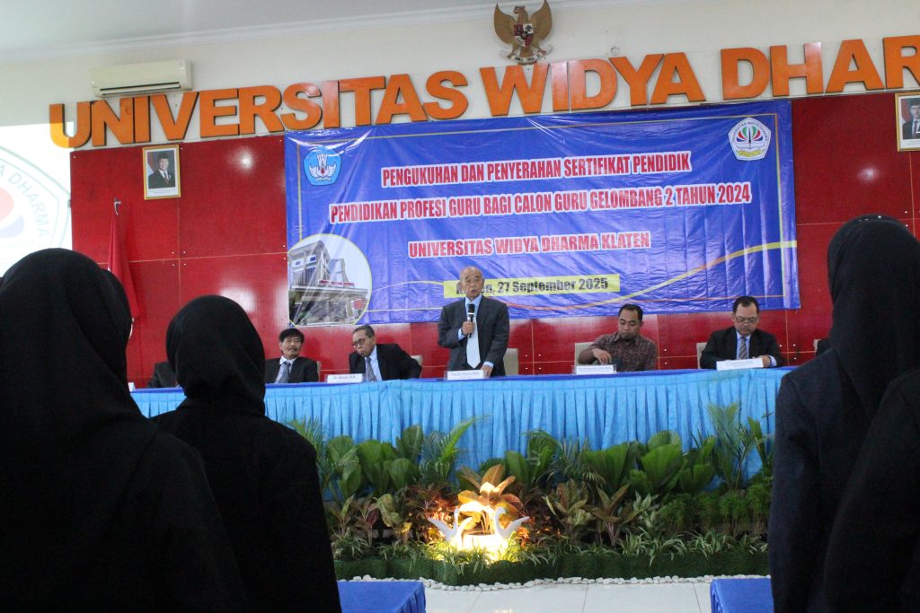 Klaten, 27 September 2025 — Universitas Widya Dharma (Unwidha) Klaten kembali mencetak sejarah dengan mengukuhkan 156 lulusan Program Pendidikan Profesi Guru (PPG) Prajabatan Gelombang-2 Tahun 2024 sebagai Guru Profesional, dalam sebuah prosesi yang berlangsung khidmat dan penuh haru.